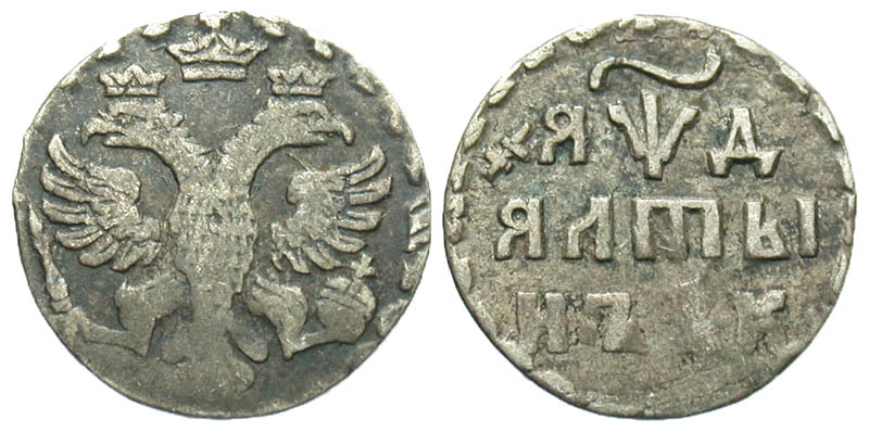 Russia. Peter I "The Great". 1689-1725. AR altyn (12.7 mm, 0.81 g, 12 h). 1704. Crowned double headed eagle, crown between their heads / Three-lined legend within wreath. Diakov 2; Bitkin 1156; KM 119. toned VF.