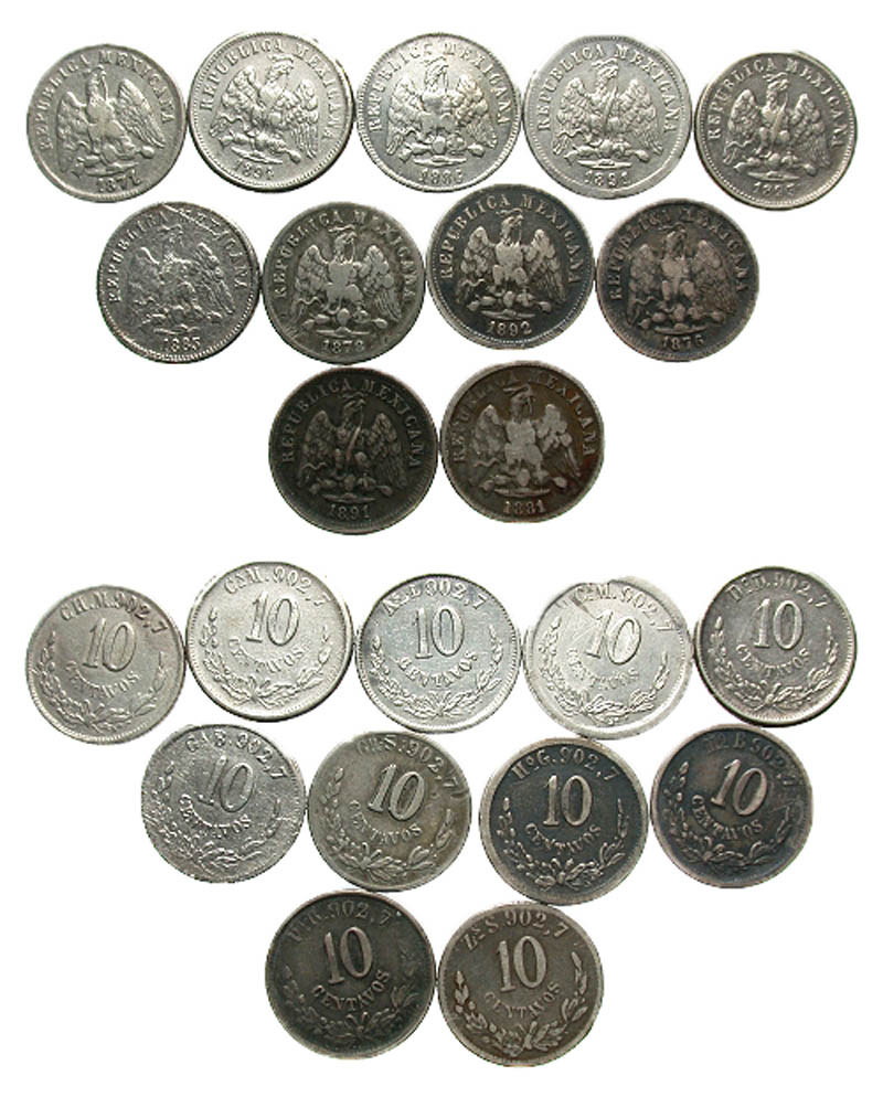 Lot of 11 Mexican AR 10 Centavos, all 11 mints. A complete set of all 11 mints to strike this type. Date ranges from 1871-1894. Most are EF.