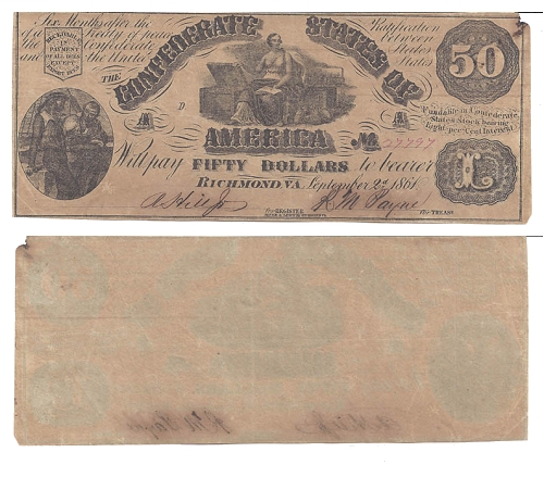 Confederate States of America, 50 Dollar Note, 1861. 1861, 50 dollar note. Moneta seated on treasure chests, sailor left, pink background. Richmond, September 2nd, 1861. Book value is $128 in Good. Type 14, Criswell 59-78. VF.