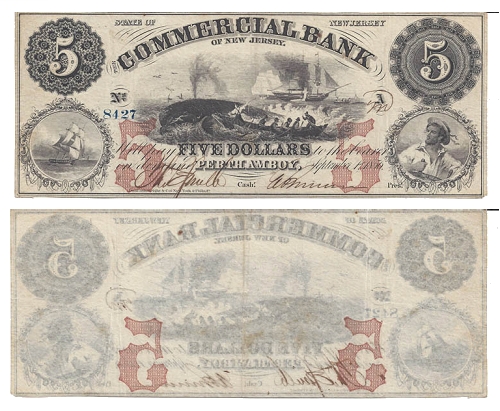U.S. Obsolete note: $5, Commercial Bank of New Jersey, Perth Amboy. 1856. Whaling scene, ship, and ship's pilot. 1856. Book value $350. Crisp XF+.
