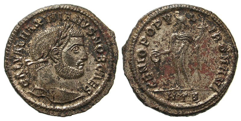 Galerius. As Caesar, A.D. 293-305. Æ Follis (28.1 mm, 9.54 g, 1 h). Heraclea, A.D. 297-298. GAL VAL MAXIMIANVS NOB CAES, laureate head right / GENIO POPVLI ROMANI, Genius standing left, holding patera and cornucopia; HTB in exergue. RIC 20b. VF, silvered.