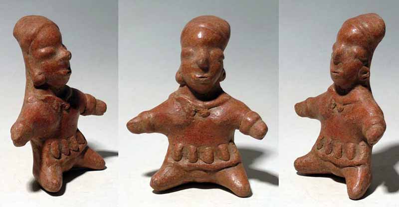 Colima Figure. A fine Colima figure from West Mexico, ca. 300 BC – 300 AD. This seated male is 5” high and is adorned with a necklace, ear spools, bracelets and ornamented belt. Good mineral deposits are visible on the highly burnished red slip. Ex Rendon collection.