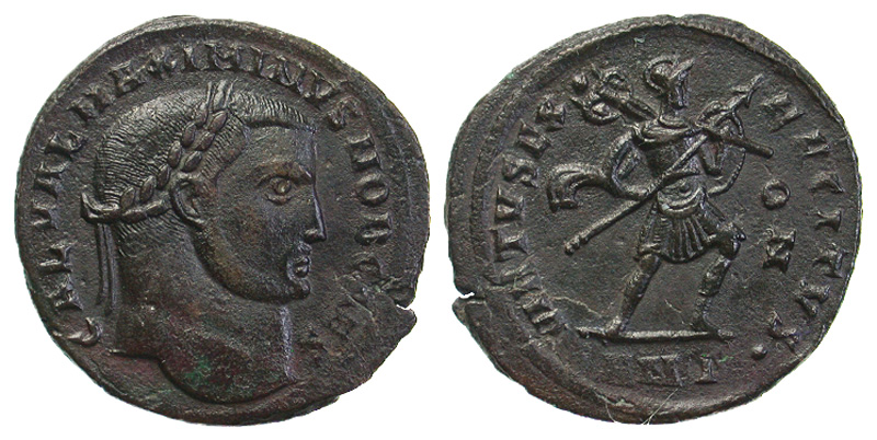Maximinus II Daza. As Caesar, A.D. 305-308. Æ Follis (25.7 mm, 5.19 g, 0 h). Antioch, A.D. 308. GAL VAL MAXIMINVS NOB CAES, laureate head right / VIRTVS EXERCITVS, Virtus advancing right, holding spear and trophy over shoulder: ANT dot in exergue. RIC 86. near EF.
