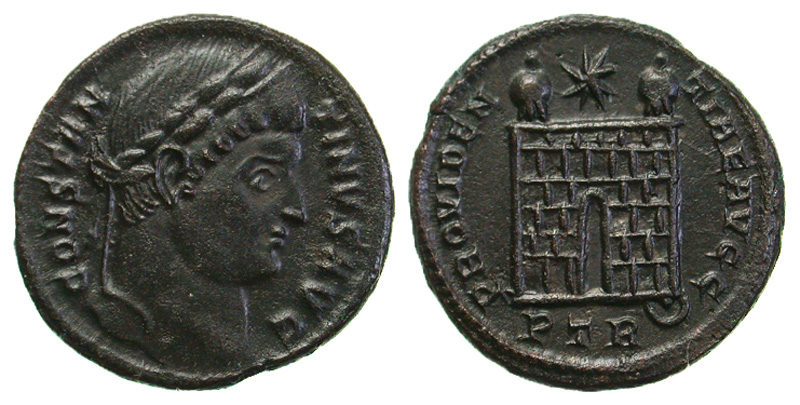 Constantine I. A.D. 307/10-337. Æ 3 (19.1 mm, 3.63 g, 6 h). Trier, A.D. 326. CONSTANTINVS AVG, laureate head right / PROVIDENTIAE AVGG, campgate with two turrets and one star above; PTR crescent in exergue. RIC 475; LRBC 28. EF.