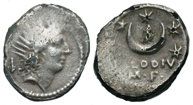 P. Clodius M.f. Turrinus. 42 B.C. AR fourrée denarius (20.0 mm, 2.76 g, 5 h). Illegal mint. Radiate head of Sol right; quiver to left / P·CLODIVS/·M·F·, Crescent moon surrounded by five stars. Crawford 494/21; CRI 182; Sydenham 1115; RSC Claudia 17. Fine.