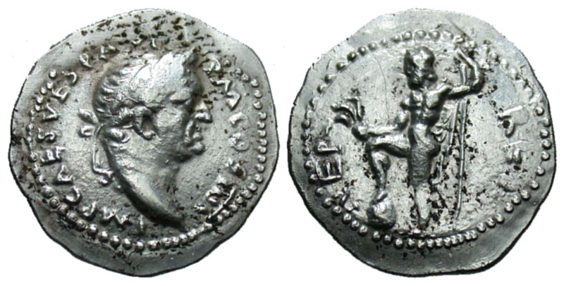 Vespasian. A.D. 69-79. AR denarius (18.5 mm, 3.07 g, 5 h). Antioch mint, Struck A.D. 72-73. IMP CAES VESP AVG P M COS IIII, laureate head right / NEP RED, Neptune standing left, foot on globe, holding acrostolium and scepter. RIC 1555; RPC 1928; RSC 274. near EF, minor deposits.