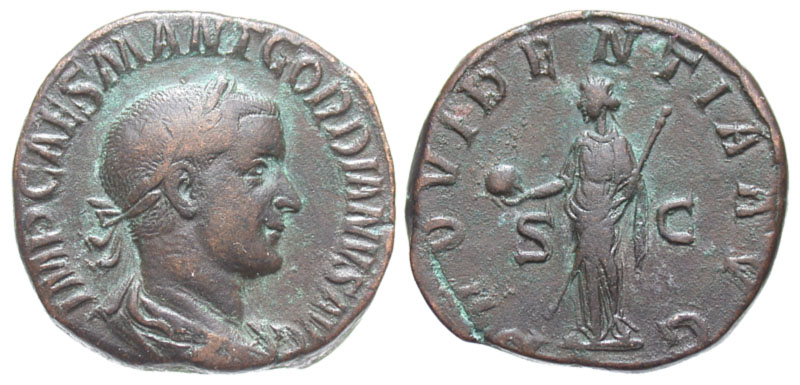 Gordian III. A.D. 238-244. Æ sestertius (29.9 mm, 20.96 g, 11 h). Rome mint, Struck A.D. 238. IMP CAES M ANT GORDIANVS AVG, laureate, draped and cuirassed bust right / PROVIDENTIA AVG, S-C, Providentia standing left, holding globe and scepter. RIC 257a. VF, green patina.