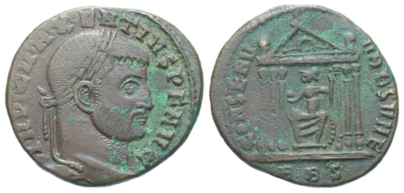 Maxentius. A.D. 306-312. Æ Follis (23.8 mm, 6.13 g, 5 h). Rome mint, Struck A.D. 308-310. IMP C MAXENTIVS P F AVG, laureate head right / CONSERV VRBS VAE, Roma seated facing, head left, in hexastyle temple, globe in her right hand, scepter in left; RBS in exergue. RIC 210. aVF, green highlights.