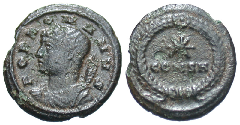 Constantine I. A.D. 307/10-337. Æ 4 (14.4 mm, 0.99 g, 11 h). Constantinople mint, Struck ca. A.D. 330. Rare. POP ROMANVS, draped bust of Genius Romanii facing left, cornucopia over shoulder / Wreath around, star over CONSH. RIC 22; LRBC 1067. aVF.