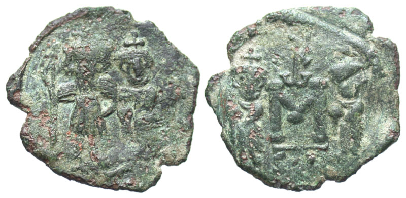 Constans II. 641-668. Æ follis (24.3 mm, 3.45 g, 6 h). Syracuse mint, Struck A.D. 659-668. Constans with long beard, crowned and in military dress, holding long cross, and Constantine IV, unbearded and crowned, on right, holding holding globus cruciger / Large M, Heraclius, crowned, wearing chlamys, standing on left, holding cross on globe, TKw monogram above, Tiberius, crowned, wearing chlamys, standing on right, holding globus cruciger. SBV 1110; DOC 181. Fine.