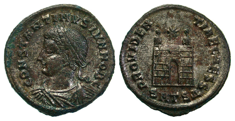 Constantine II. As Caesar, A.D. 317-337. Æ 3 (19.0 mm, 3.03 g, 12 h). Thessalonica, A.D. 326-328. CONSTANTINVS IVN NOB C, laureate, draped and cuirassed bust left / PROVIDENTIAE CAESS, campgate with two turrets and one star above, SMTSΔ in exergue. RIC 157; LRBC 815. gVF, silvered.