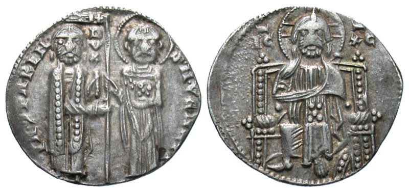 Italy, Venice. Jacapo Contarini. 1275-1280. AR grosso (20.3 mm, 7 g, 12 h). S M VENETI IAC TARIN, DVX, doge standing left and St. Mark, nimbate, standing facing, both holding pendant between them; stars flanking / IC-XC, Christ, nimbate, seated facing on high-backed throne. Scarfea 42; Biaggi 2783. gVF.