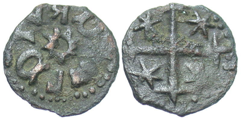 Balkans, Wallachia. Radu I. ca. A.D. 1377-1383. Æ ban (13.4 mm, 0.70 g, 12 h). + Iω PDIVRD, sunburst / Cross crosslet; stars in each angle. MBR 78a. aVF.