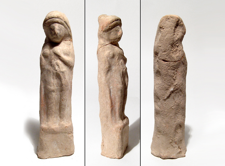 Phoenician Figure of Asharte. A Phoenician terracotta figure of Asharte, c. early 2nd Millennium BC, mold-made and in the guise of a warrior, standing on integrated plinth, left hand against her chest. Nicely detailed with traces of white slip remaining underneath the earthen deposits. H: 6 ½” (16.5 cm). Repaired at shoulders. Ex Orange County private collection.