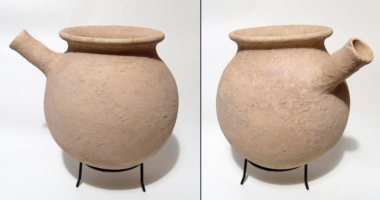 Bronze Age Spouted Jar. A Bronze Age spouted jar, c. 2000 - 1500 BC, round-bodied with flared rim, cylindrical spout at about a 45 degree angles to the body. 6” x 7 ¼” (15.2 x 17.8 cm). Intact, earthen deposits. Ex Las Vegas collection.