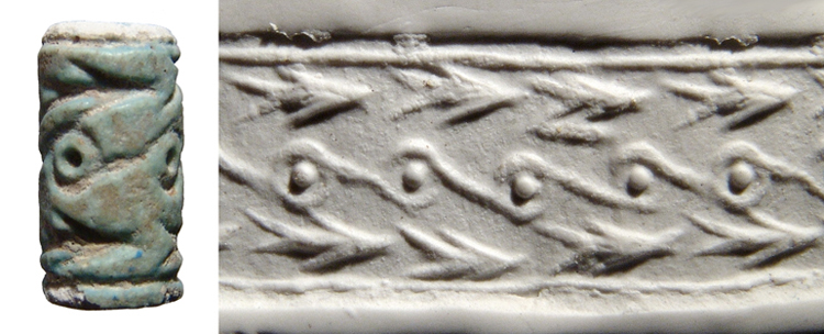 Neo-Assyrian Cylinder Seal. A nice Neo-Assyrian green faience cylinder seal, c. 934 - 609 BC, with an attractive design consisting of a scroll device between stylized fish. L: 17 mm. Intact, minor edge chipping, good color. Ex Los Angeles private collection.