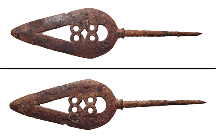 Byzantine Arrow Tip. A nice Byzantine open-work arrow tip, c. 5th - 8th Century AD, with rounded base and tapering flat blade, the cut-out interior of which with four joined circles, long narrow tang a back. L: 5 ½” (14 cm). Intact with a stable oxide patina. Ex Los Angeles private collection.