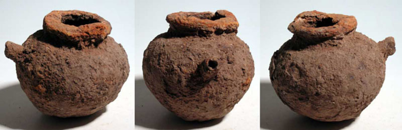 Kushan Iron Vessel. A rare Kushan iron pouring vessel, c. 1st – 4th Century. This globular jar is 4” in diameter, has a flared rim and pouring spout. Heavy encrustation. Ex Khan estate.