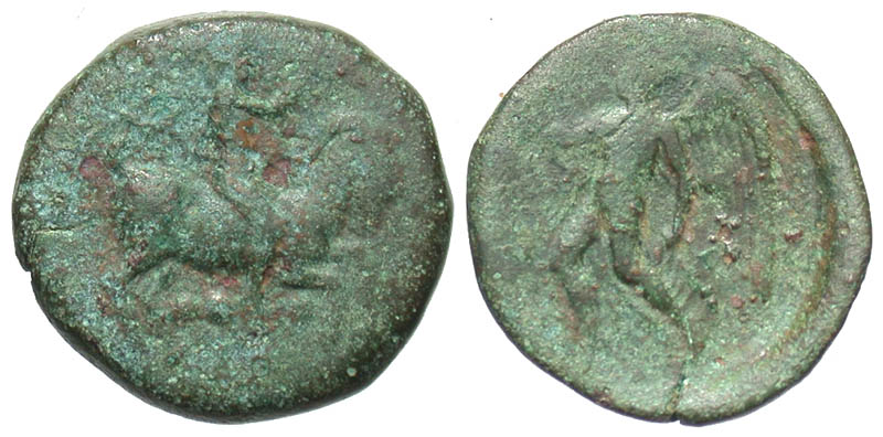Sicily, Himera. Ca. 420-410 B.C. Æ tetras (16.6 mm, 2.78 g, 6 h). Rare. Nude rider on a goat right, blowing into conch; three pellets below / IMEPA, Nike advancing left, holding open wreath. Calciati 32; BMC 52; SNG ANS 185. aVF, green patina.