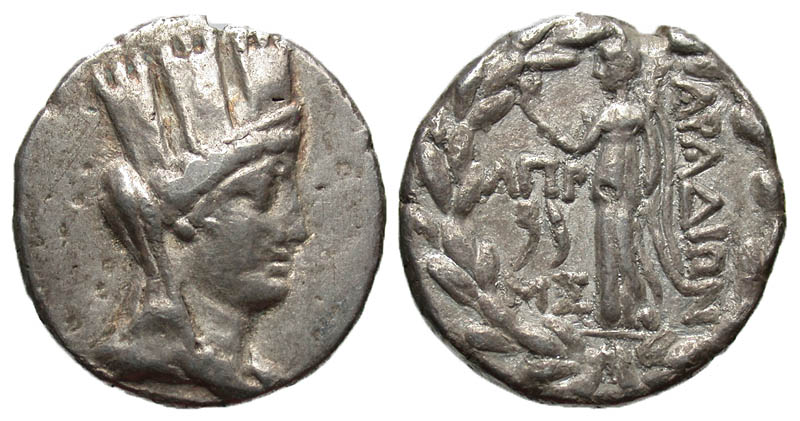 Phoenicia, Arados. 137-45 B.C. AR tetradrachm (25.6 mm, 14.68 g, 11 h). Dated year 184 = 76/75 B.C. Turreted, draped and veiled bust of Tyche right / APAΔIΩN, Nike standing left, holding aphlaston and palm; ΔΠP / Phoenician letter / MΣ to left. BMC 256; Duyrat 3679; SNG Cop -. aVF.