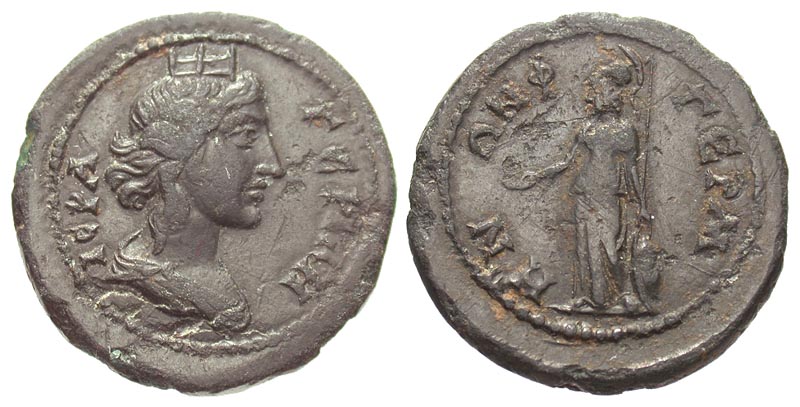 Lydia, Germe. Civic Issue. Time of Gordian III, A.D. 238-244. Æ 25 (24.5 mm, 8.40 g, 6 h). Scarce. IEPA ΓEPMH, turreted and draped bust of Tyche right / ΓEPMHNΩN, Athena standing left, holding patera and spear, shield leaning at right. SNG von Aulock 1096; SNG Righetti 708; SNG BN 956 corr. (described with altar). VF, black patina, minor pitting.
