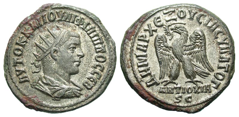 Syria, Seleucis and Pieria. Antiochia ad Orontem. Philip II. A.D. 247-249. BI tetradrachm (27.5 mm, 13.11 g, 7 h). Struck A.D. 248. AVTOK K M IOVΛI ΦIΛIΠΠOC CEB, radiate, draped, and cuirassed bust right / ΔHMAPX EΞOVCIAC VΠATO Γ, ANTIOXIA SC, eagle standing left, holding wreath in beak, with wings spread. Prieur 413; SNG Cop 718; McAlee 1029. VF.
