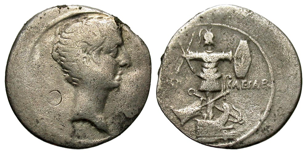 Octavian. 44-27 B.C. AR denarius (20.8 mm, 3.53 g, 2 h). Uncertain Italian mint, 30-29 B.C. Bare head right / IMP - CAESAR, naval trophy set on prow of galley right; crossed rudder and anchor at base. RIC 265a; RSC 119; BMCRE 625. Fine, banker's mark, off center reverse.