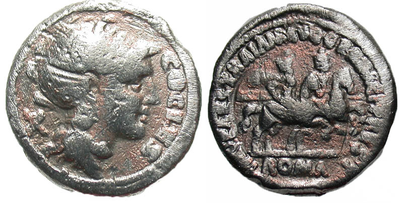 Trajan. A.D. 98-117. AR denarius (19.0 mm, 2.53 g, 7 h). Modern copy of a Becker forgery of a Restitution issue. COCLES, helmeted head of Roma right; X behind / IMP CAES TRAIAN AVG GER DAC P P REST, ROMA in exergue, The Dioscuri riding right. Hill, Becker 164. aVF, toned.