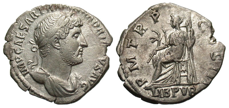 Hadrian. A.D. 117-138. AR denarius (19.3 mm, 3.40 g, 7 h). Rome mint, Struck A.D. 119-125. Scarce. IMP CAESAR TRAIAN HADRIANVS AVG, laureate and draped bust right / P M TR P COS III, LIB PVB, Libertas seated left, holding branch and scepter. RIC 127; RSC 309; BMCRE 215. aVF.
