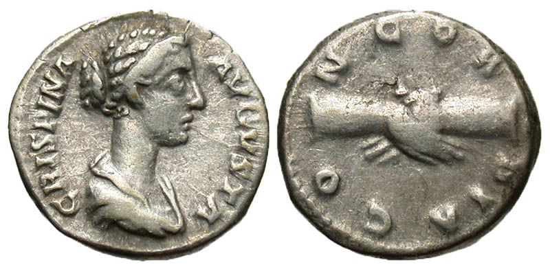 Crispina. Augusta, A.D. 178-182. AR denarius (17.8 mm, 3.44 g, 11 h). Rome mint. CRISPINA AVGVSTA, draped bust right / CONCORDIA, clasped hands. RIC 279a; RSC 9. aVF.