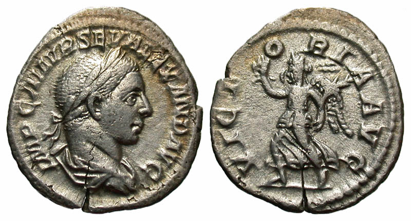 Severus Alexander. A.D. 222-235. AR denarius (19.9 mm, 2.88 g, 11 h). Rome mint, Struck A.D. 225. IMP C M AVR SEV ALEXAND AVG, laureate and draped bust right / VICTORIA AVG, Victory advancing left, holding wreath and palm. RIC 180; BMCRE 268; RSC 564. VF, flan crack.