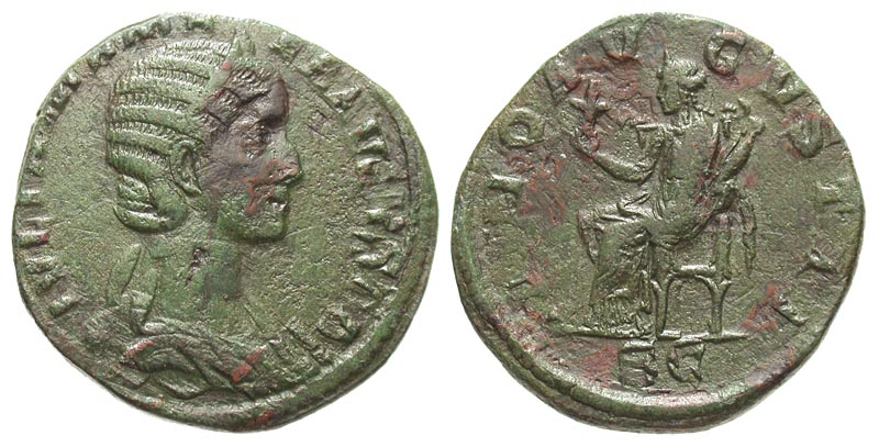 Julia Mamaea. Augusta, A.D. 222-235. Æ sestertius (28.9 mm, 21.87 g, 1 h). Rome mint, Struck A.D. 231. IVLIA MAMAEA AVG, draped bust right, wearing stephane / IVNO AVGVSTAE, SC, Juno seated left, holding flower and infant. RIC 683 (S Alexander); BMCRE 759 (S Alexander). VF, green patina.