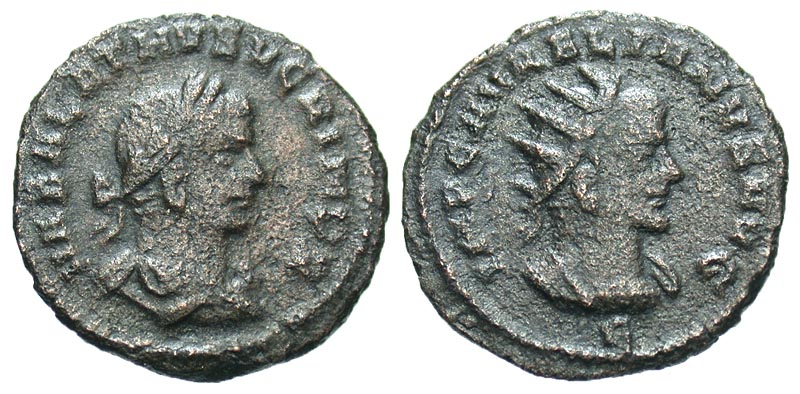 Vabalathus. Usurper, A.D. 268-272. Æ antoninianus (19.1 mm, 3.45 g, 11 h). Antioch mint, Struck A.D. 271-272. VABALATHVS VCRIM DR, laureate, draped, and cuirassed bust right / AVRELIANVS AVG, radiate and cuirassed bust right, Є below. RIC 381. aVF, porous.