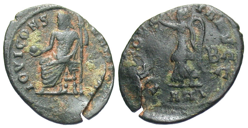 Anonymous Pagan Issues. Ca. A.D. 305-313. Æ 1/12 nummus (18.1 mm, 1.26 g, 11 h). Antioch mint. IOVI CONSERVATORI, Jupiter seated left on throne, holding globe and scepter / VICTORIA AVGG, Victory advancing left, holding wreath and palm; B in right field, ANT in exergue. McAlee 171(b); Van Heesch 2(b); Vagi 2955. aVF, black patina with red highlights.