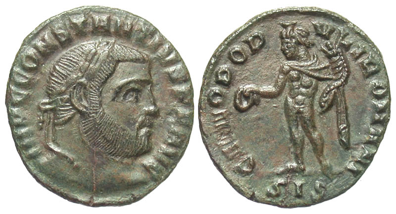 Lot 23-123. Constantius I. A.D. 305-306. Æ quarter follis. Siscia mint, Struck A.D. 305. Scarce. As Augustus.