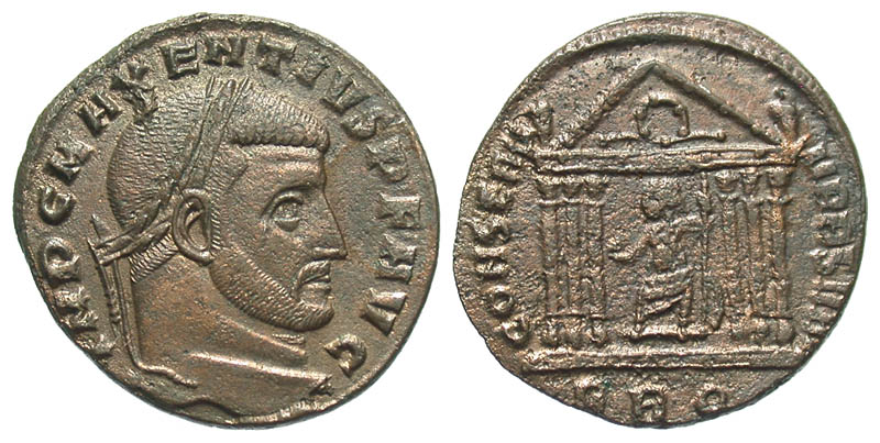 Maxentius. A.D. 306-312. Æ Follis (25.1 mm, 6.53 g, 6 h). Rome mint, Struck A.D. 308-310. IMP C MAXENTIVS P F AVG, laureate head right / CONSERV VRBS VAE, Roma seated facing, head left, in hexastyle temple, globe in her right hand, scepter in left; RBQ in exergue. RIC 210. VF, cleaned.