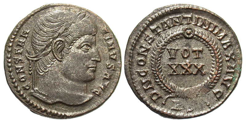 Constantine I. A.D. 307/10-337. Æ 3 (19.5 mm, 2.97 g, 6 h). Rome mint, Struck A.D. 321. CONSTANTINVS AVG, laureate head right / D N CONSTANTINI MAX AVG, legend around VOT/XXX; RS in exergue. RIC 232. VF, fully silvered.