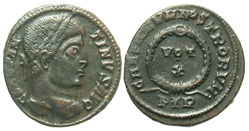 Constantine I. A.D. 307/10-337. Æ 3 (18.4 mm, 2.65 g, 5 h). Trier mint, Struck A.D. 324. CONSTANTINVS AVG, laureate head right / CAESARVM NOSTRORVM, VOT X, legend within wreath; PTR in exergue. RIC 440 var. aVF.