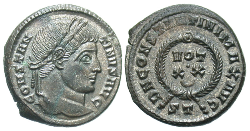 Constantine I. A.D. 307/10-337. Æ 3 (19.6 mm, 3.45 g, 7 h). Ticinum mint, Struck A.D. 322-325. CONSTANTINVS AVG, laureate head right / D N CONSTANTINI MAX AVG, legend around VOT/XX/crescent; PT in exergue. RIC 167; LRBC 479. gVF, some silvering remains.