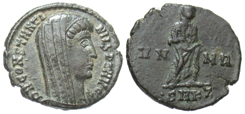 Divus Constantine I. Died A.D. 337. Æ 4 (15.2 mm, 1.60 g, 5 h). Cyzicus mint, Struck A.D. 347-348. DV CONSTANTINVS PT AVGG, veiled head right / VN-MR, Constantine, veiled, standing right; SMKZ in exergue. RIC 46; LRBC 1304. VF.