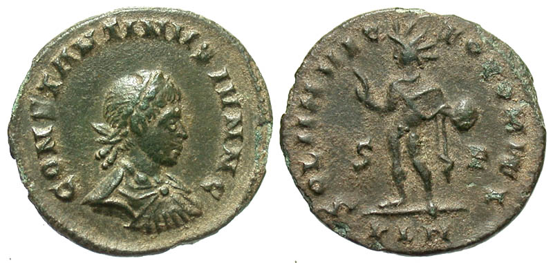 Constantine II. As Caesar, A.D. 317-337. Æ 3 (19.9 mm, 2.62 g, 6 h). London mint, Struck A.D. 317. Scarce. CONSTANTINVS IVN NC, laureate, draped and cuirassed bust right / SOLI INVICTO COMITI, Sol standing left, chlamys across left shoulder, holding globe, right hand raised; S-P across fields, PLN in exergue. RIC 118. VF.