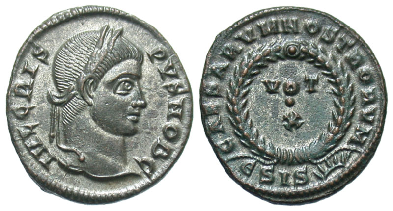 Constantine II. As Caesar, A.D. 317-337. Æ 3 (19.9 mm, 3.73 g, 1 h). Siscia mint, Struck A.D. 321-324. CONSTANTINVS IVN NOB C, laureate head right / CAESARVM NOSTRORVM around VOT X in two lines within wreath; ЄSIS branch in exergue. RIC 176. gVF.