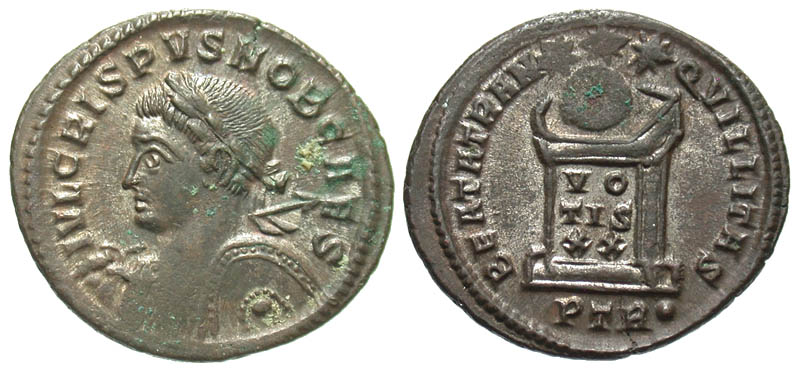 Crispus. Caesar, A.D. 317-326. Æ 3 (20.5 mm, 3.08 g, 6 h). Treveri mint, Struck A.D. 317-326. IVL CRISPVS NOB CAES, laureate and cuirassed bust left, holding spear and shield / BEATA TRANQVILLITAS, globe on altar inscribed VOT-IS-XX, 3 stars above, PTR· in exergue. RIC 308. VF.
