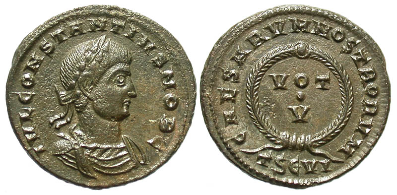 Constantius II. As Caesar, A.D. 324-337. Æ 3 (18.5 mm, 2.83 g, 1 h). Thessalonica mint, Struck A.D. 324. IVL CONSTANTIVS NOB C, pearl-diademed, draped and cuirassed bust right / CAESARVM NOSTRORVM, VOT V, legend within wreath; TSЄVI in exergue. RIC 130. aVF.
