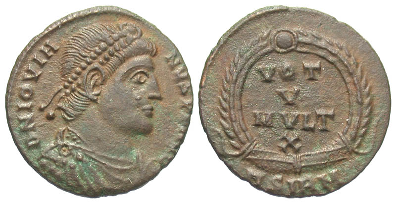 Jovian. A.D. 363-364. Æ 3 (19.3 mm, 2.65 g, 1 h). Sirmium mint. D N IOVIANVS PF AVG, pearl-diademed, draped and cuirassed bust right / VOT V MVLT XX, legend within wreath; BSIRM in exe. RIC 118; LRBC 1623. VF.