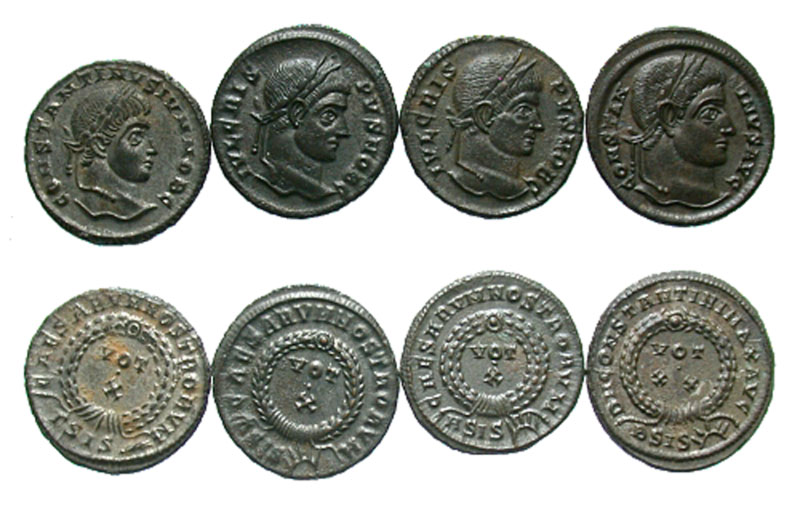Lot of 4 VOT XX Coins. Constantine the Great and Crispus. VOT XX reverse types. VF or better.