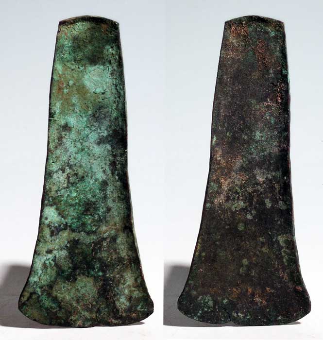 Aztec Copper Currency. A heavy Aztec celt ingot from Mexico, ca. 1300 – 1500 AD. This piece of early trade currency is 5” long and is heavily encrusted. Rare type. Ex Magor collection.