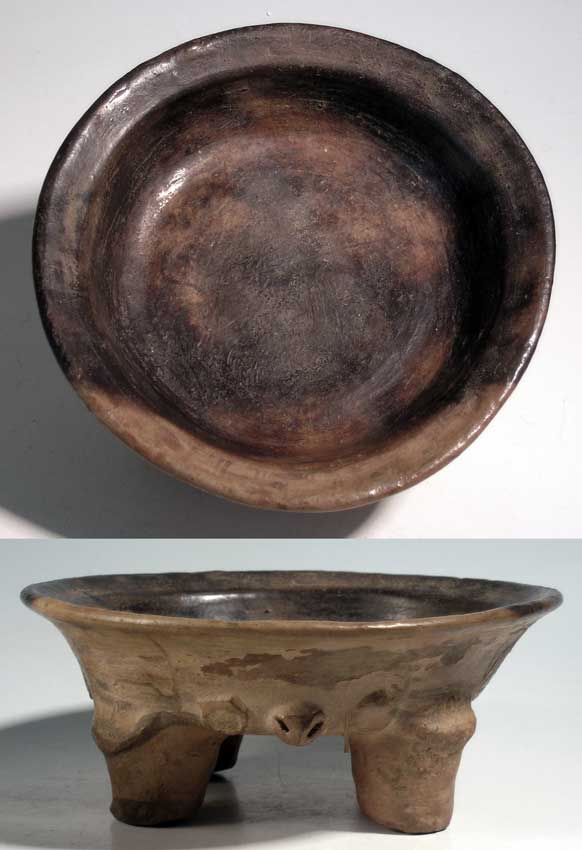 Maya Tetrapod. A fine Maya tetrapod plate from El Salvador, ca. 400 – 700 AD. This finely sculpted dish is 6” in diameter and is carried on the back of a turtle. The sides of the bowl are decorated with incised design panels and some post-firing pigment, the hollow legs contain rattles. Intact, with good mineral deposits. Ex International Unlimited Gallery.
