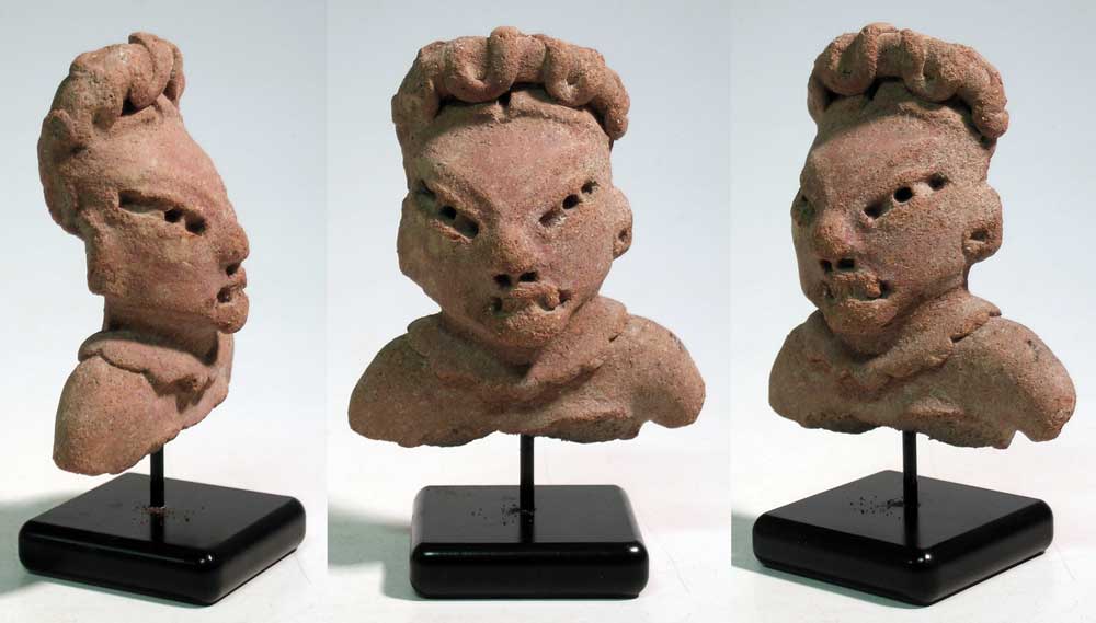 Pre-Classic Bust. An exceptional Pre-Classic figure found near Mitla in Oaxaca, Mexico, ca. 400 – 100 BC. This well preserved example is 3-1/2” high and depicts an elite individual wearing a fancy headdress. Mounted on stand. Ex Magor collection.