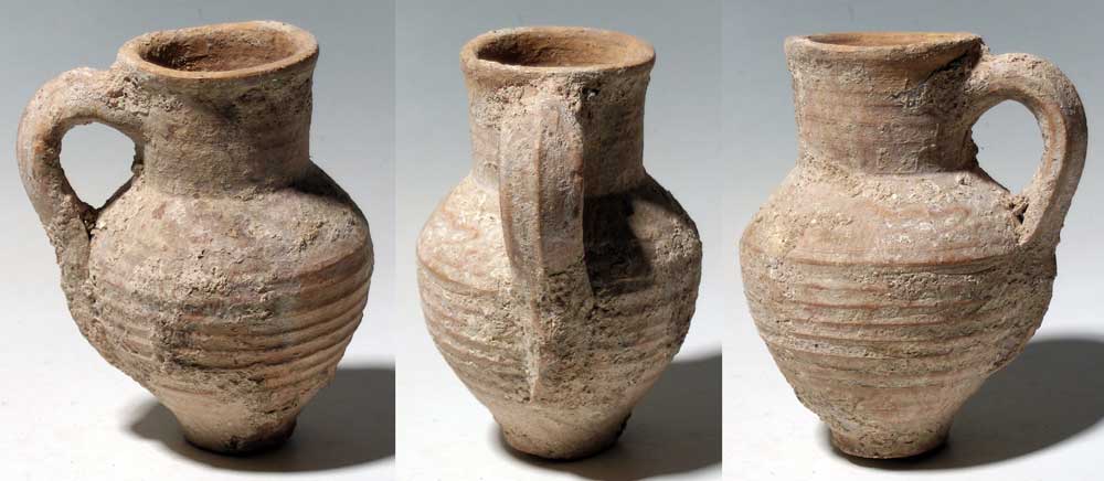 Roman Juglet. A lovely Roman juglet, c. 1st - 3rd Century AD. This nicely formed vessel is 4-1/2" high and stands on a narrow flat base. The chamber and loop handle are decorated with pronounced ridges. An elegant form, with strong mineral encrustation, nice example of the type. Ex Funiciello estate.